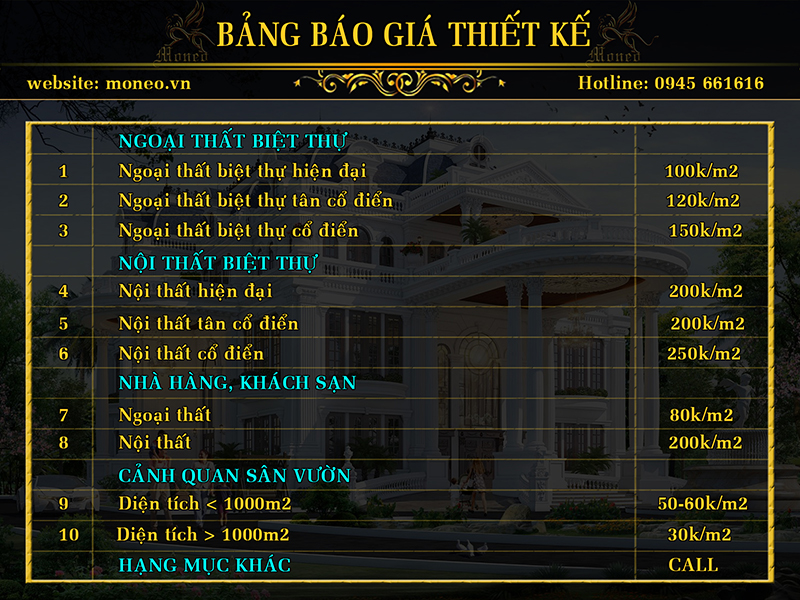 Báo giá thiết kế kiến trúc nội thất biệt thự, lâu đài của Kiến trúc MONEO áp dụng đối với những khách hàng có nhu cầu tư vấn thiết kế từ tháng 1/2019.