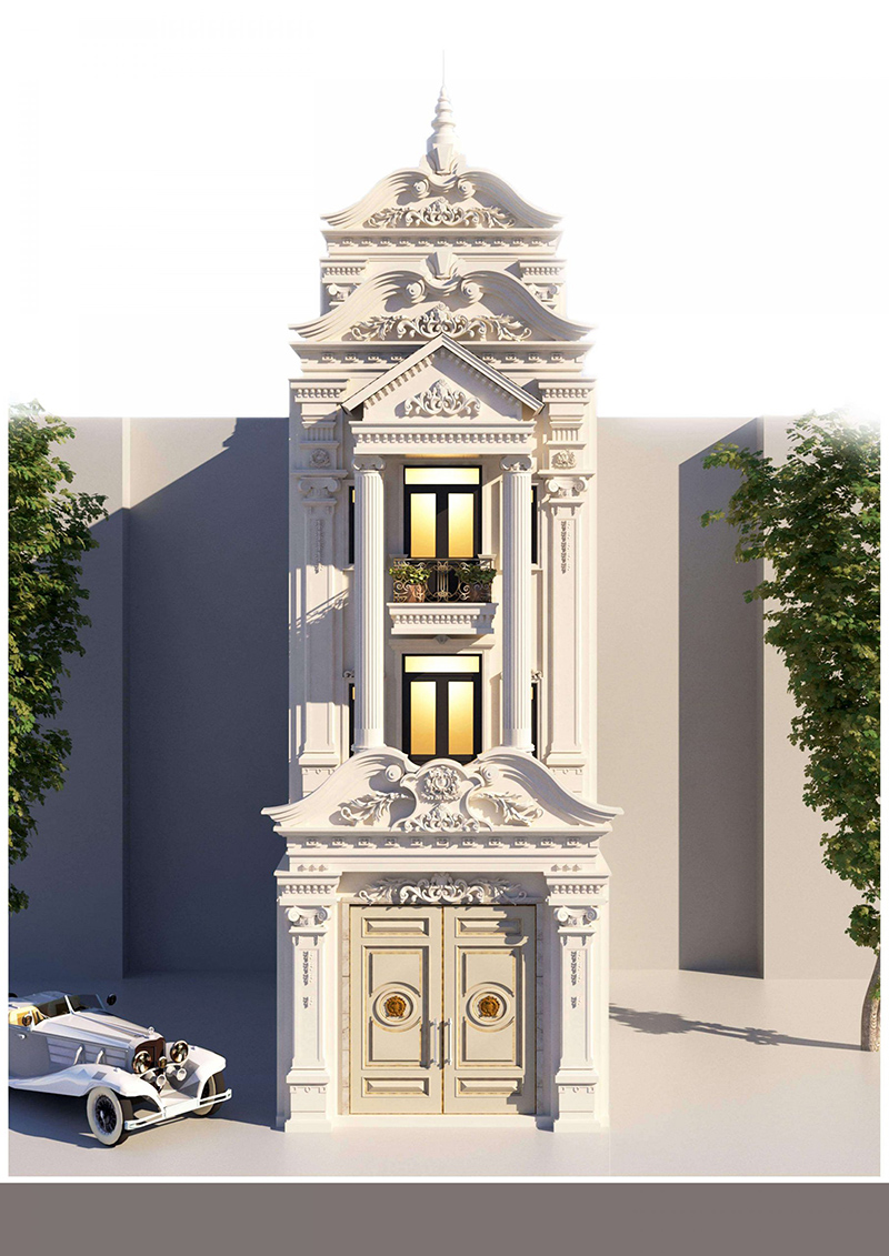 Mẫu 1: Tư vấn thiết kế nhà phố kiểu cổ điển vô cùng ấn tượng. Có thể thấy tòa bộ đặc trưng của phong cách cổ điển đều được thể hiện rõ ràng và linh hoạt trong mẫu thiết kế này. Với từng chi tiết, vật liệu hoàn thiện sử dụng như phào chỉ, các chi tiết trang trí ngoại thất, cùng với sự vấn dụng phào chỉ trang trí linh hoạt và sang trọng. Công trình này thể hiện được sự bề thế và chắc chắn vô cùng trong thiết kế. Đặc biệt hơn, với những chi tiết phào chỉ ở mặt tiền, cùng với phù điêu ở khu vực sảnh tầng 1 tạo nên được giá trị và sự sang trọng, xa hoa, cầu kì cho mẫu thiết kế. Các chi tiết mái, cũng như sảnh, phù điêu nghệ thuật khi được kết hợp với nhau tạo nên sự linh hoạt, chắc chắn và đảm bảo được trọn vẹn giá trị mà công trình mong muốn hướng tới.