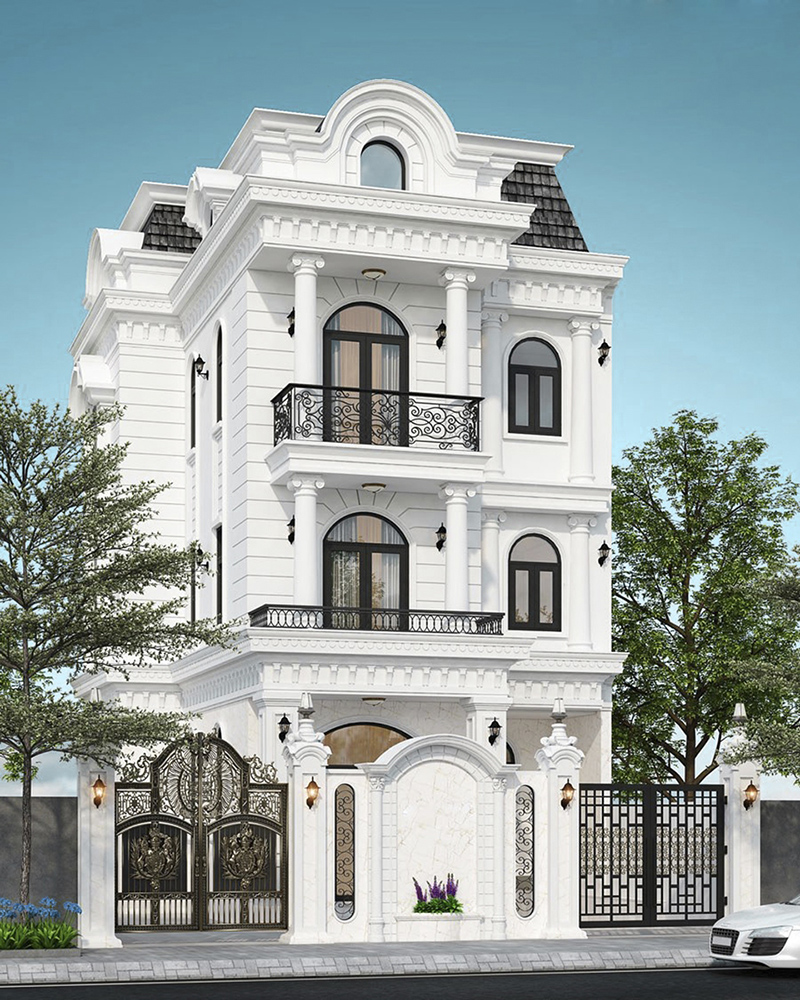 Mẫu số 4: Ngắm mẫu thiết kế nhà phố kiểu cổ điển sang trọng 1 mặt tiền. Công trình với sự chỉn chu và bố trí linh hoạt vơi 2 phương án thiết kế kiến trúc như vậy có khiến bạn hài lòng hay không. Màu sắc chủ đạo là màu tráng, kết hợp với các loại vật liệu hoàn thiện như sắt nghệ thuật, kết hợp với nhau tạo nên sự hoàn hảo và tối ưu vô cùng cho thiết kế. Đồng thời, vật liệu hoàn thiện công trình đều là các loại cao cấp, do đó mà chi phí cho việc xây dựng và hoàn thiện ngôi nhà cũng cao hơn hẳn. Thiết kế mái, cùng những chi tiết phù điêu trên mái tạo nên điểm nhấn thú vị cho không gian kiến trúc của công trình, kết hợp với phào chỉ và màu sắc mang âm hưởng cổ điển... tạo nên nét đẹp hoàn hảo và đầy thú vị cho thiết kế.