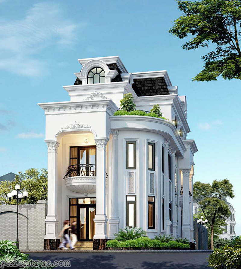 Mẫu số 3: Ngắm mẫu thiết kế nhà pố kiểu cổ điển sang trọng. 2 mặt tiền của công trình này đòi hỏi sự chỉn chu và cẩn thận hơn trong việc bố trí và sắp xếp kiến trúc. Các chi tiết ở đầu và chân cột cũng được trang trí phào chỉ vô cùng cầu kì và hợp lý, đem lại vẻ đẹp toàn diện cho không gian thẩm mỹ.