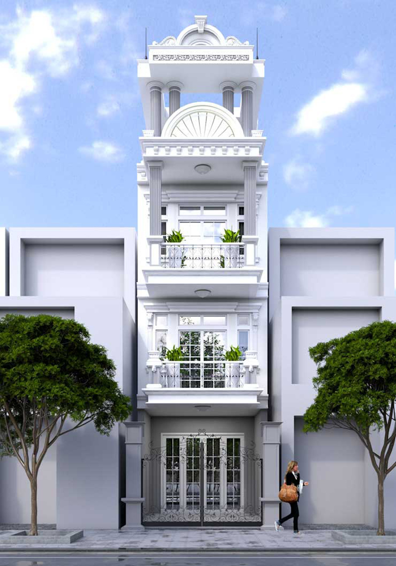Mẫu số 6: Tư vấn thiết kế nhà phố kiểu cổ điển 1 mặt tiền nhỏ hẹp. Với những đặc trưng của kiến trúc cổ điển, cùng mức đầu tư tương đối cao, những công trình này thực sự khiến cho chúng ta hài lòng về thiết kế.