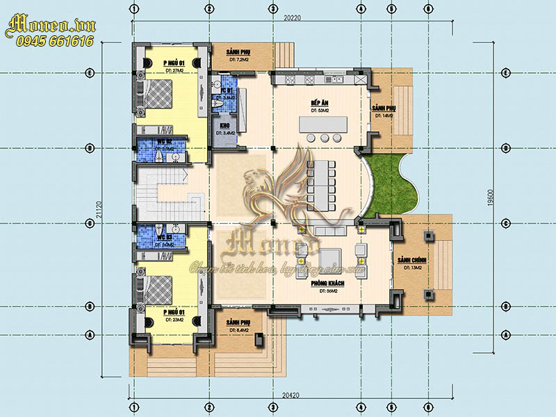 Tầng 1: sảnh chính: 13m, Phòng khách 56m2, bếp ăn: 53m2, WC 1 3,8m2