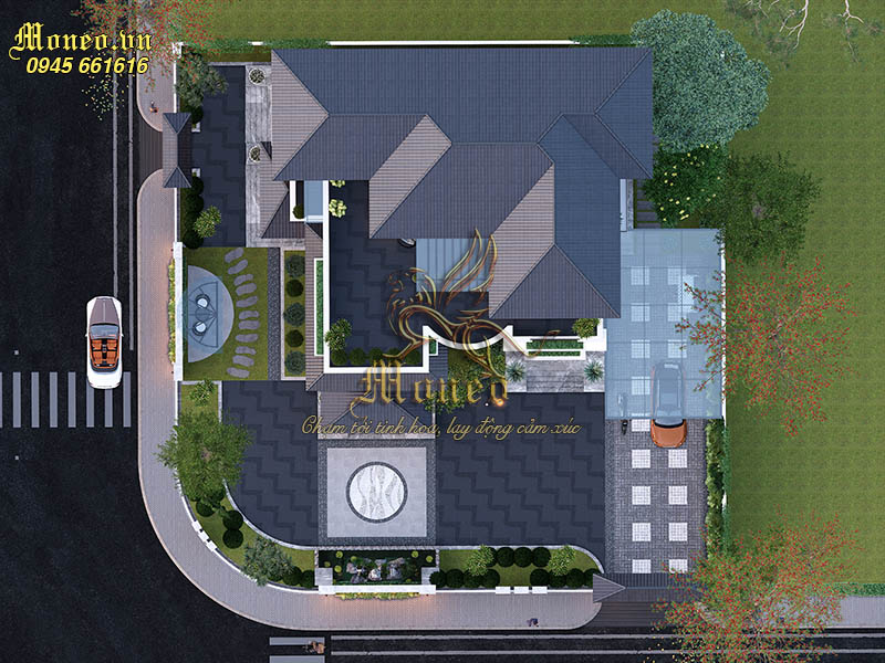 Với cách thức làm việc của Kiến trúc Moneo quý khách có thể nhận được rất nhiều ảnh 3D của từng góc trong một ngôi nhà do đó bạn có thể hình dung được ngôi nhà của bạn đến khi thiết kế xong mình sẽ nhận được một bản thiết kế ra sao. Với góc view này thể hiện được tổng thể bên trong không gian sân vườn ra sao. Có thể nói ngoài khu vực nhà được bố trí ở giữa thì không gian xung quanh được bố trí đường lưu thông cũng như các công trình phụ trợ, sân vườn tiểu cảnh. Với cách thiết kế này tạo cho không gian thoáng đãng không gian xanh mát ngập tràn ánh sáng mang đến sự mát mẻ và sống thanh bình.