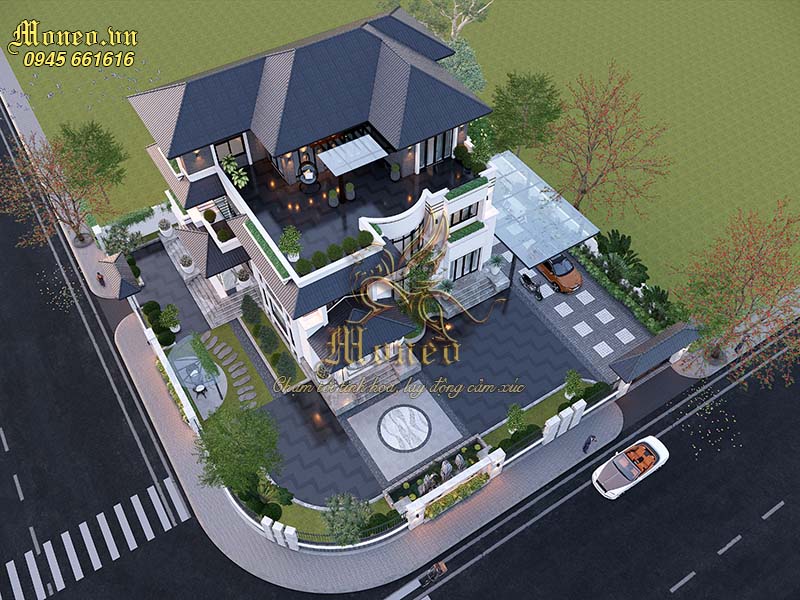 Phối cảnh 3D được view từ trên cao mẫu biệt thự 3 tầng 250m2 hiện đại sang trọng