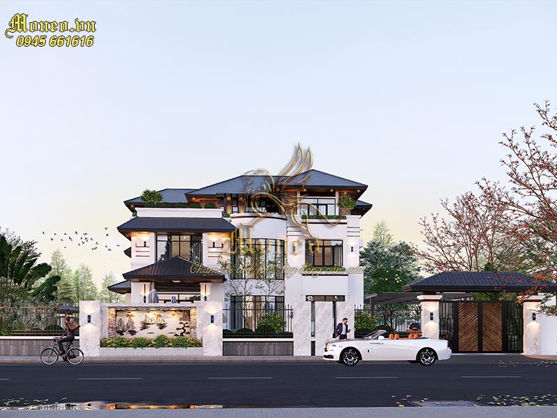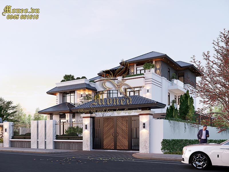 Màu sắc ngoại thất nhà màu an toàn và phong cách của ngôi biệt thự được thể hiện qua cách phối màu sắc cũng như hình khối. Đây cũng là tone màu hottrend của năm 2021 nên bạn hoàn toàn có thể lựa chọn được sắc trắng sữa của ngôi nhà kết hợp với những điểm nhấn màu nâu của màu gỗ. Cửa được sử dụng với cửa kính mảng miếng lớn có thể tận dụng được không gian và ánh sáng bên ngoài.