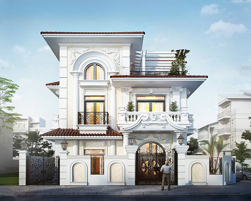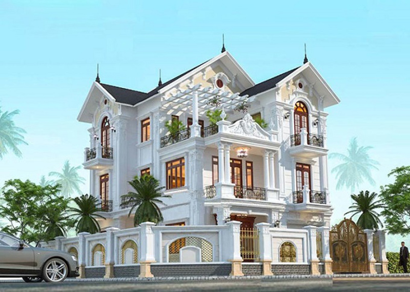 1. Hình ảnh mẫu thiết kế biệt thự cổ điển mái thái sang trọng. Không gian kiến trúc của ngôi nhà được đánh giá cao với tính thẩm mỹ, cùng với những đặc trưng đầy đủ của phong cách cổ điển, ngôi nhà đảm bảo đưcọ giá trị và ấn tượng kiến trúc thẩm mỹ vô cùng lớn. Những công trình này luôn được đề cao tính thẩm mỹ, với sự cầu kì trong thiết kế kiến trúc mặt tiền, và đặc trưng từ các chi tiết cột, phào chỉ, tường... tạo nnee sự hoàn thiện cho tổng thể không gian kiến trúc của ngôi nhà đó. Thiết kế mái thái, mái ngói làm đặc trưng, vận dụng cả ở mái sảnh tầng 1, tầng 2, và mái che tầng 3 tạo nên kiến trúc tổng thể nhất quán cho ngôi nhà biệt thự 3 tầng cổ điển mái thái.