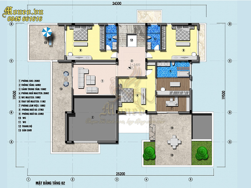 * Tầng 2: Phòng SHC 26m2; thông tầng 40m2; sảnh trung tâm 15m2; Phòng ngủ master 26m2; WC master 11m2; phòng làm việc 10m2; Phòng ngủ 3: 27m2; phòng ngủ 4: 23m2; WC, thang bộ, sân chơi
