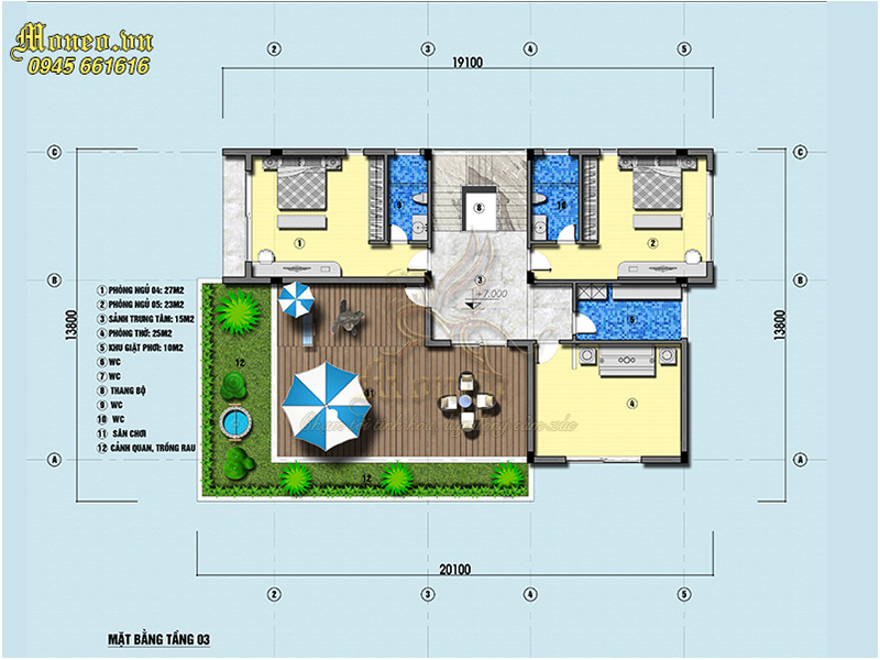 * Tầng 3: Phòng ngủ 5: 27m2; phòng ngủ 6: 23m2; sảnh trung tâm 15m2; phòng thờ 25m2; khu giặt phơi 10m2; wc, thang bộ, sân chơi, cảnh quan