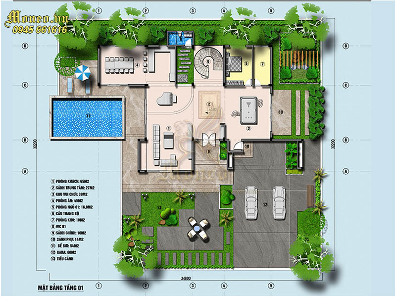 * Tầng 1: Sảnh trung tâm 27m2; Phòng khách 65m2; Khu vui chơi 39m2; phòng ăn 45m2; phòng ngủ 1; 16,8m2; Cầu thang bộ; Phòng kho 10m2; wc1; sảnh chính 10m2; sảnh phụ 14m2; bể bơi 54m2; gara 60m2; sân vườn, tiểu cảnh