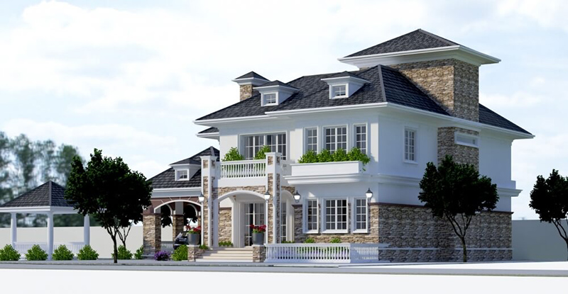 Mẫu số 1: Mẫu biệt thự 2 tầng tân cổ kiểu pháp bề thế và sang trọng. Công trình thể hiện được sự chắc chắn bởi hình khối kiến trúc. Cũng như đảm bảo được sự tối ưu trong cách bố trí công năng sử dụng. Đặc biệt hơn, không gian kiến trúc của ngôi nhà biệt thự này còn được ứng dụng thêm những loại vật liệu mới như đá ốp ngoại thất, vị trị của cột, tường. dưới mái... đem đến cho ngôi nhà vẻ đẹp hoài cổ, sang trọng và đảm bảo được tính bền vững.