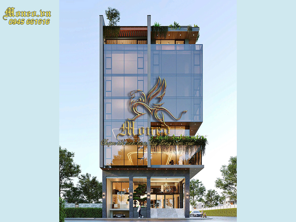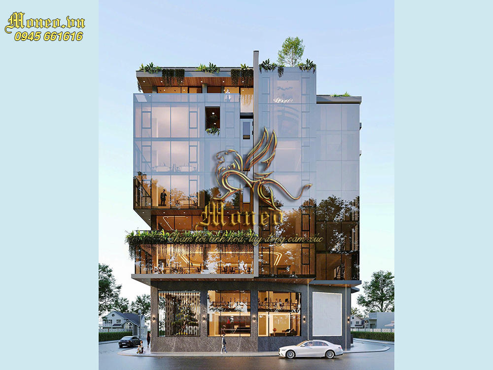Mẫu thiết kế tòa nhà 7 tầng 250m2 không chỉ trú trọng đến tính thẩm mỹ mà còn đảm bảo các yếu tố về kiến trúc bền vững. Tòa nhà được xây dựng với vật liệu kính góp phần tạo hiệu ứng rộng rãi cho không gian.