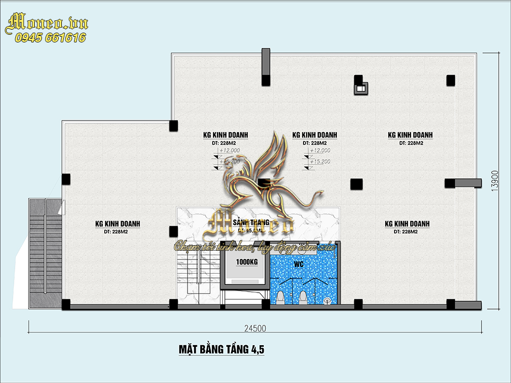 -Tầng 4: Kinh doanh 228m2, kinh doanh 228m2, kinh doanh 228m2, kinh doanh 228m2, sảnh thang 15.8m2, Wc