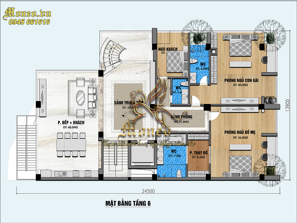 -Tầng 6: Sảnh trung tâm 33m2, Phòng bếp + phòg khách 60m2, 3 phòng ngủ (12m2, 40m2, 36.5m2), 2 Wc, sảnh phòng 18m2.