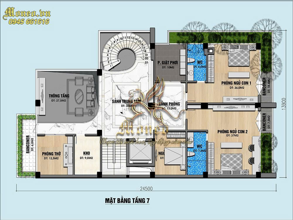 -Tầng 7: Phòng thờ 12.5m2, 3 phòng ngủ (36m2, 37m2), , kho, thông tầng 27.5m2, 2wc