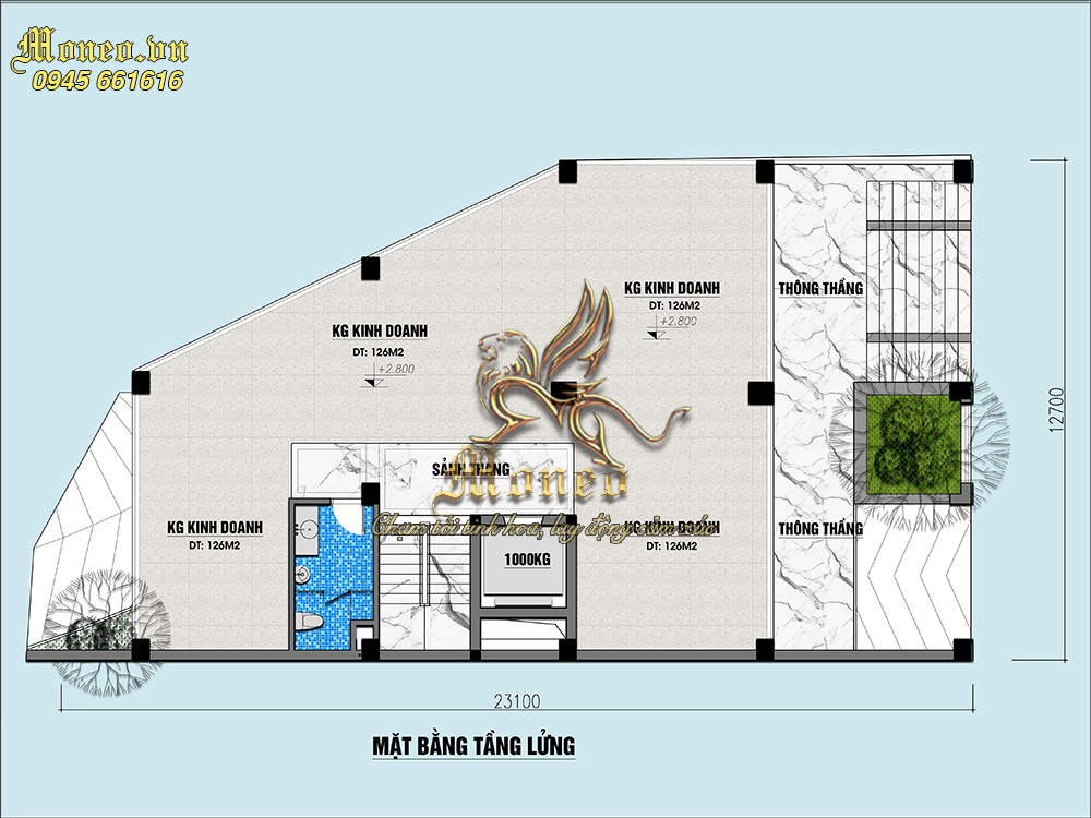 -Tầng 2: Kinh doanh 126m2, kinh doanh 126m2, kinh doanh 126m2, sảnh thang, Wc