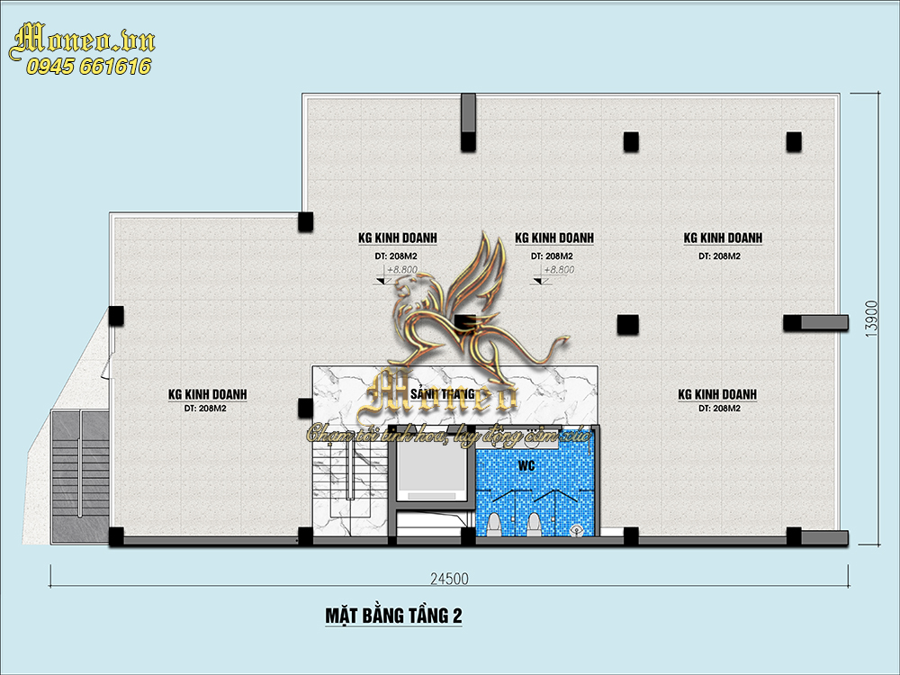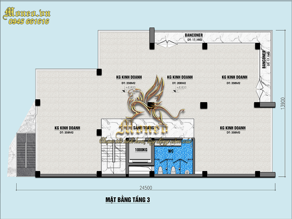-Tầng 3: Kinh doanh 208m2, kinh doanh 208m2, kinh doanh 208m2, kinh doanh 208m2, sảnh thang, Wc, Banconer 17.1m2.