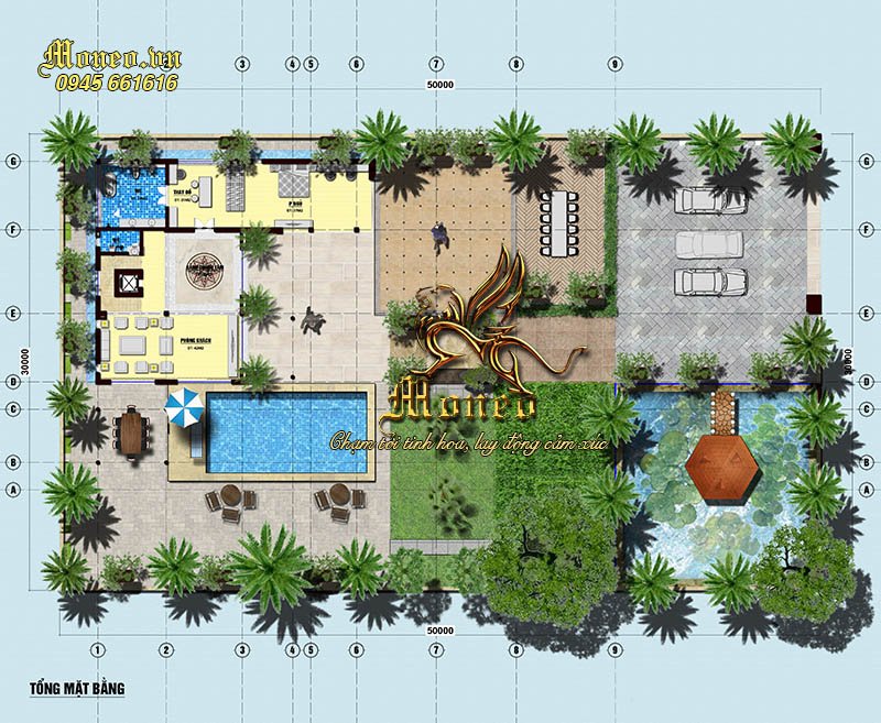 Tổng mặt bằng công năng sử dụng cho mẫu biệt thự 250m2 3 tầng được quy hoạch trên diện tích rộng có kích thước 30x50m. Nhìn tổng thể, gia đình anh sở hữu được một mảnh đất xây dựng tương đối đẹ và vuông vắn. Với kích thước và diện tích như vậy, KTS MONEO đã bố trí và quy hoạch riêng cho từng vị trí, không gian sử dụng. Từ ngoài vào trong, phía tbne ngoài là gara ô tô, ao cá, có chòi canh để thư giãn ngồi câu cá. Sau đó là sân vườn nhỏ, bể bơi và ngôi nhà. Các khu vực không gian chức năng, các khu vực trong toàn bộ ngôi nhà được bố trí và sắp xếp vô cùng hài hòa và hợp lý, thể hiện được sự hiện đại, trọn vẹn và tối ưu trong tổng thể không gian sống. Khu vực vườn cây xung quanh được thực hiện chỉn chu... hệ thống cây cối bao quanh đem lại cho ngôi nhà sự thoáng đãng, mát mẻ và cực kì gần gũi với thiên nhiên. Đây cũng là ưu điểm thường thấy ở trong nhiều công trình nhà ở, kiến trúc hiện đại.