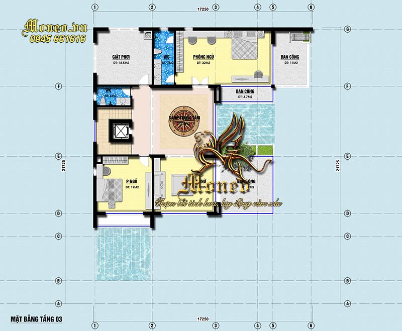 Không gian sử dụng của tầng 3 được thiết kế với đầy đủ tiện ích, công năng sử dụng: Bao gồm: sảnh trung tâm 25m2; phòng thờ 20m2; ban công 17m2; phòng ngủ 6: 19m2; phòng ngủ 7: 32m2; wc5: 7m2l giặt phời 18,5m2; ban công 11m2; wc6: 4m2 ban công 3,7m2