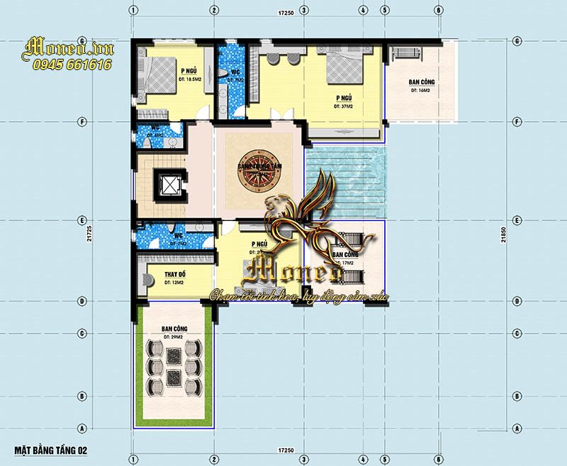 - Tầng 2: Sảnh 25m2; P.ngủ 3: 18,5m2; wc3: 4m2; P.ngủ 4: 37m2; P.ngủ 5: 20,7m2; wc 4: 7m2; P.thay đồ 12m2