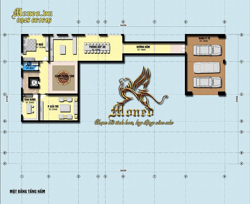 Tầng hầm của mẫu biệt thự 250m2 3 tầng được bố trí với công năng sử dụng bao gồm: đường hầm 18m2; phòng bếp ăn 52m2; phòng ngủ 18,5m2; sảnh trung tâm 25m2; wc1: 4m2; kho rượu 27m2; phòng giải trí 27m2. Sự kết nối trong ngôi nhà, mặt bằng công năng tạo nên tính hấp dẫn cho tổng thể không gian nội thất của công trình. Khu vực phòng bếp ăn rộng rãi và thoáng đãng, kết hợp với phòng sinh hoạt đảm bảo được yêu cầu về thẩm mỹ, công năng sử dụng... mang đến cho mẫu thiết kế sự hài hòa vô cùng. Khu vực sảnh trung tâm cũng là điểm nhấn cho không gian của tầng hầm. Đem lại sự bề thế, rộng rãi và kết nối với không gian bên trên.