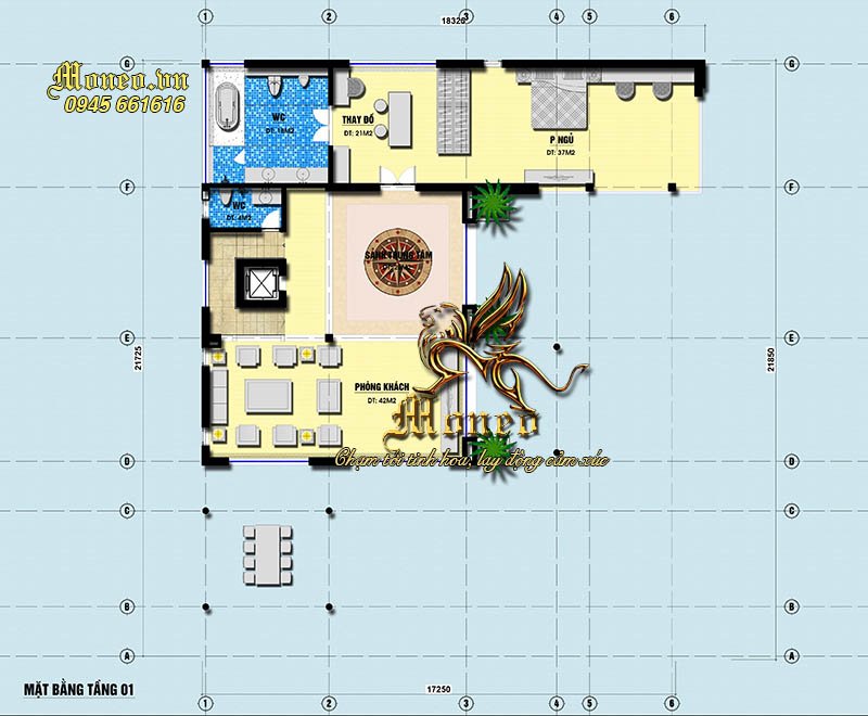 Không gian sử dụng của tầng 1 sẽ được bố trí với các phòng chức năng bao gồm: phòng khách 42m2; sảnh trung tâm 25m2; wc2 4m2; wc3: 18m2; phòng thay đồ 21m2; phòng ngủ 2: 37m2.