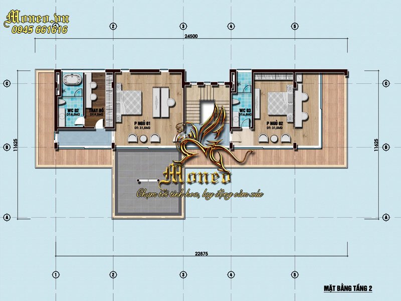 - Tầng 2: Phòng ngủ 1: 31,5m2; phòng thay đồ 9,5m2; wc2 8,5m2; Phòng ngủ 2: 31,5m2; wc 3 6,8m2