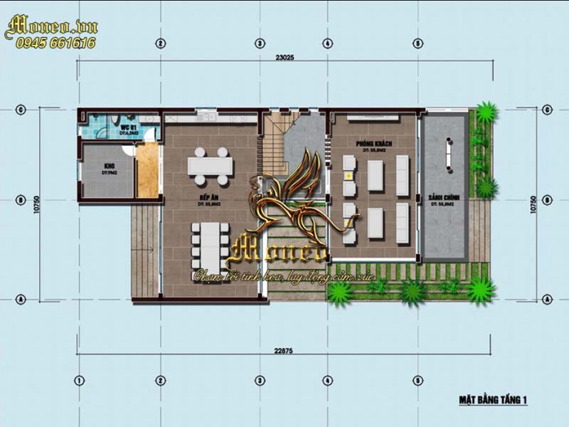 - Tầng 1: sảnh chính 55,6m2; phòng khách 55,6m2; bếp ăn 55,6m2; kho 9m2; wc1 6,5m2