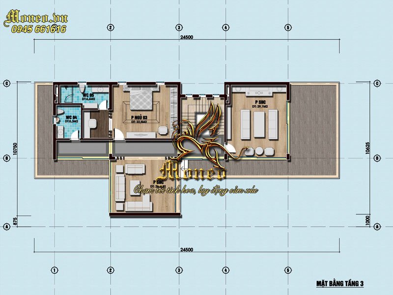 Không gian nội thất tầng 3 gồm: Phòng ngủ 3 22,5m2; wc 4 5,3m2; wc5 6,6m2; phòng sinh hoạt chung 29,1m2; Phòng hát karaoke 24,4m2