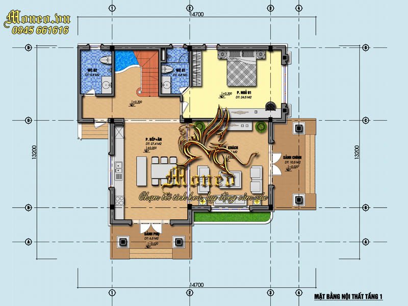 +) Tầng 1: Sảnh chính: 10m2, Phòng khách 18m2, Phòng bếp ăn: 19m2, WC1: 4m2, Phòng ngủ: 14m2, WC1: 4m2.