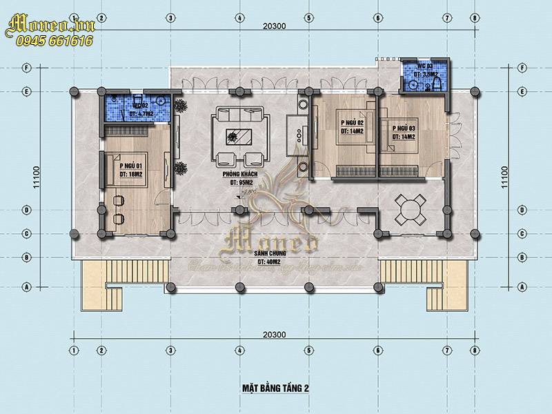 +) Tầng 2: Phòng khách: 95m2; Phòng ngủ 1: 18m2; Phòng ngủ 2: 14m2; Phòng ngủ 3: 14m2; WC2: 4.7m2; WC3: 3.5m2; Sảnh chung: 40m2.