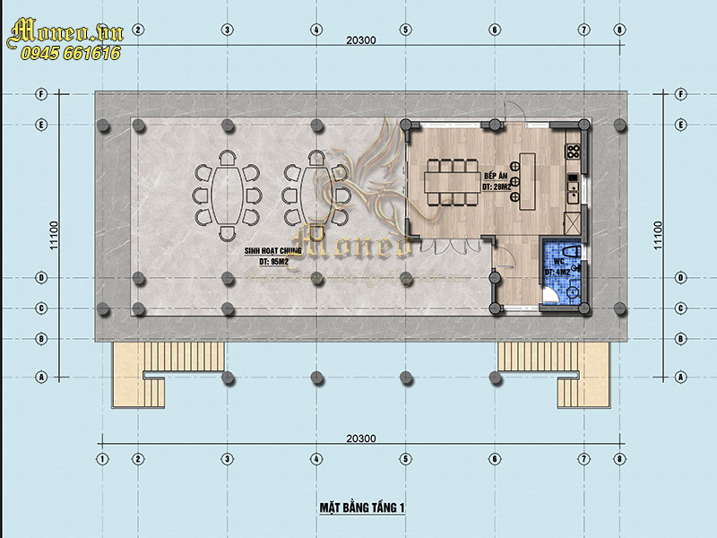+) Tầng 1: Bếp ăn: 28m2; Sinh hoạt chung: 95m2; WC: 4m2;