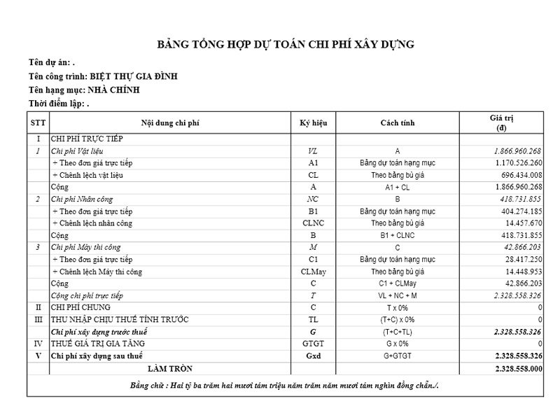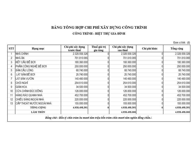 Có thể thấy: Hạng mục xây dựng và thi công trọn gói nhà chính ( chính là mẫu siêu biệt thự 300m2 hiện đại 1 tầng) được ước tính chi phí lên khoảng 2.3 tỷ đồng. Còn những hạng mục còn lại trong tổng thể khuôn viên xây dựng công trình như nhà ăn, bể bơi, sân cầu lông, sân vườn, ... và những hệ thống hàng rào. cổng xung quanh khác... Tổng mức chi phí đầu tư cho toàn bộ hạng mục công trình này là hơn 4.9 tỷ đồng. Lưu ý, đây cũng là mảng ước tính chi phí dự tính. Để đi sâu vào làm việc thi công trọn gói, nhà thầu xây dựng sẽ còn phải cung cấp đến chủ đầu tư bảng vật tư vật liệu, số lượng, chủng loại vật tư vật liệu cần thiết cho mỗi công trình. Bảng ước tính chi phí xây dựng này được tính toán và kê khai vào thời điểm tháng 4/2021. Tính theo đơn giá và hệ số xây dựng, cũng như giá nguyên vật liệu, nhân công tại thời điểm bấy giờ. Do đó, con số chênh lệch trên tùy địa điểm xây dựng, cũng như thời gian thi công... cũng có thể khác nhau giữa mỗi thời điểm.