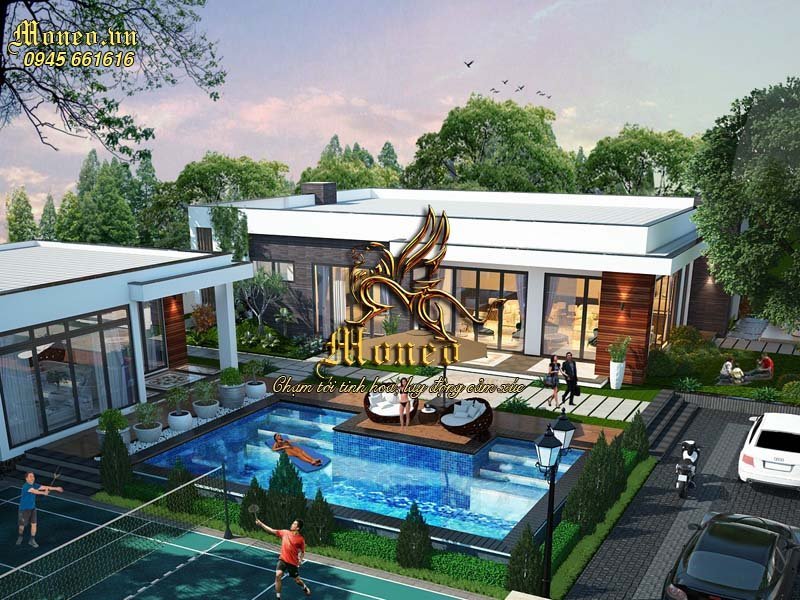 Khu vực nhà chính, nhà ăn và bể bơi được kết nối với nhau. Khu vực nhà ăn cũng được thiết kế và thi công theo đúng phong cách kiến trúc hiện đại, phù hợp với tổng thể khuôn viên của nhà chính. Điều này tạo nên sự thống nhất và rõ ràng kết nối với không gian kiến trúc. Các khu vực sân chơi, sân trước nhà chính và bể bơi cũng được linh hoạt sử dụng các loại gạch lát nền hiện đại, mới mẻ, ... tạo nên sự hiện đại và sang trọng cho tổng thể không gian.