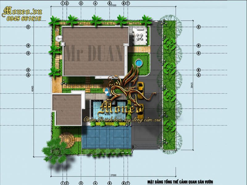 Mặt bằng tổng thể cảnh quan sân vườn: Thiết kế siêu biệt thự hiện đại 1 tầng mái bằng
