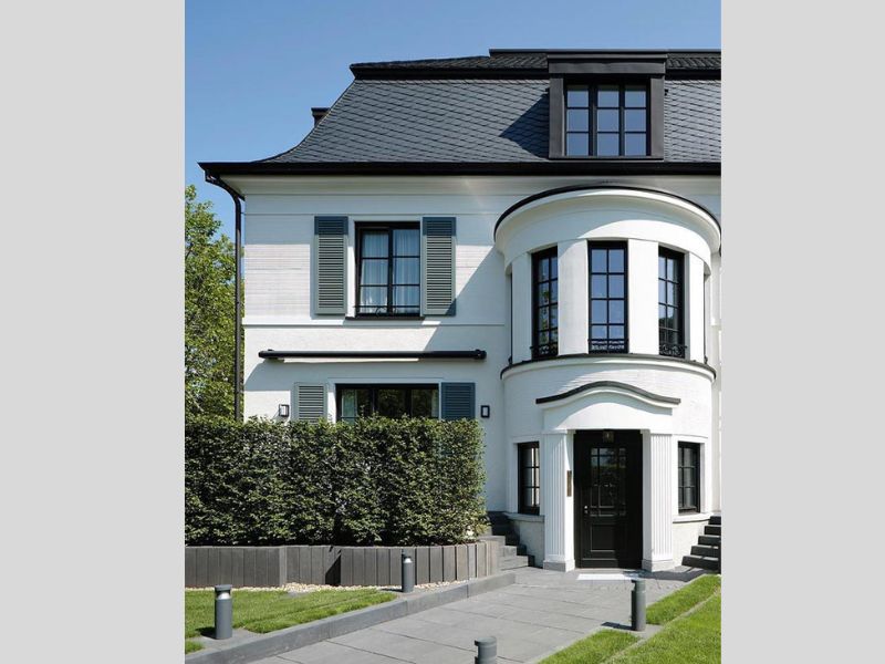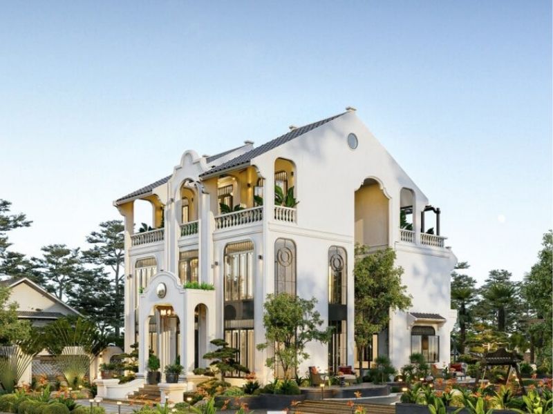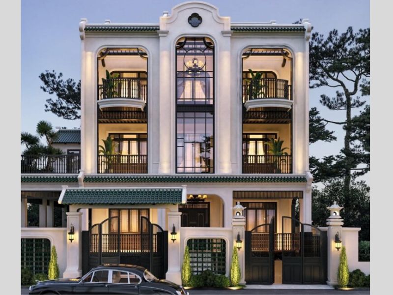 Biệt thự phong cách Indochine nổi bật với thiết kế kiến trúc tân cổ điển, kết hợp giữa các yếu tố kiến trúc phương Đông và Phương Tây. Màu sắc tinh tế và nhẹ nhàng. Thường là các gam màu trung tính, như xanh dương, xám, nâu và trắng.