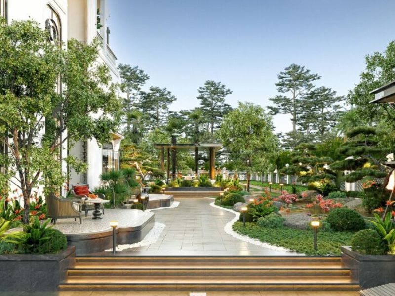 Sân vườn trong phong cách Indochine thường rất rộng lớn, được bao quanh bởi tường bao và các hàng rào. Các cây cối và hoa lá được trồng xen kẽ với lơi đi lát đá. Ngoài ra có tiểu cảnh đài phun nước tạo nên không gian thư giãn và lãng mạn.