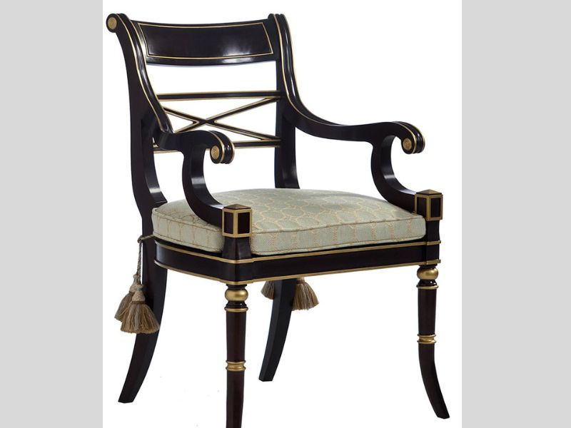Sàn gỗ, tường có hoa văn trang trí. Cửa sổ cao được trang trí bằng rèm gỗ hoặc mành tre đơn giản. Bàn ghế bọc da hoặc gỗ với đường cong mềm mại, chạm trổ tinh tế. Bàn có nhiều ngăn kéo, đèn treo hoặc hoặc đèn sàn kiểu Pháp đơn giản nhưng đẹp mắt