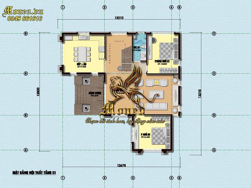+) Tầng 1: Sảnh: 6.6m2; P.khách: 33m2; P.bếp + ăn: 17.7m2; Phòng ngủ 1: 13.8m2; WC 1: 4m2; P.ngủ 2: 14.1m2