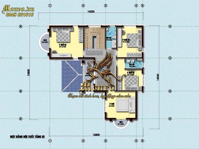 +) Tầng 2: Ban công 3: 2.2m2; Ban công 2: 5.9m2; Ban công 1: 1.4m2; Phòng thờ: 16m2; Phòng ngủ 4: 15.5m2; Phòng ngủ 5: 14.2m2; Phòng SHC: 12.5m2; Sảnh: 5m2; Phòng ngủ 3: 18.7m2; WC 2: 4.6m2; Phòng ngủ 2: 13m2; WC3: 4m2.
