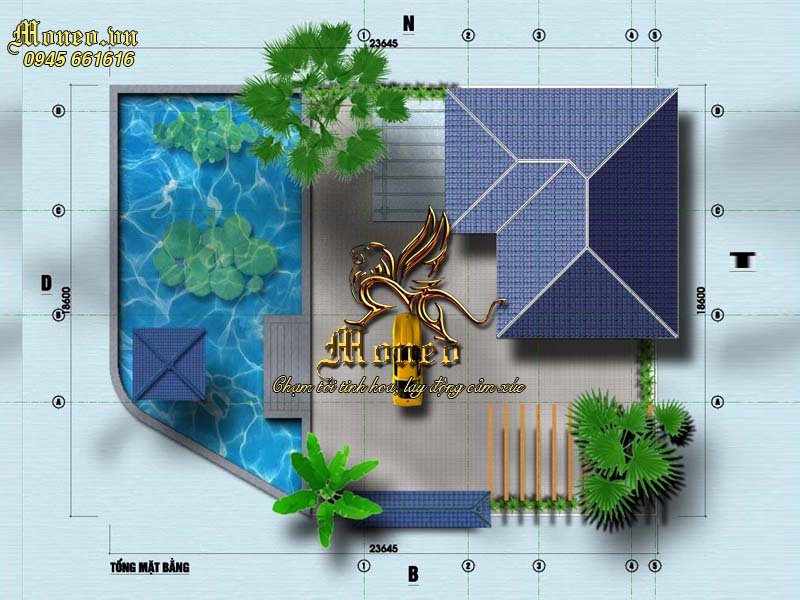 Kích thước lô đất của gia đình là 18.6x23.6m. Với kích thước như vậy, KTS đã sắp xếp và bố trí mặt bằng công năng, quy hoạch rõ ràng từng hạng mục thiết kế trong bản vẽ tổng thể để khách hàng có thể dễ dàng hình dung nhất về công trình xây dựng. Nhà ở phía trong cùng, còn tiếp đến là sân và ao nước. Việc sắp xếp và bố trí phù hợp với nhu cầu, sở thích của chủ đầu tư, đảm bảo được các yêu cầu về tính thẩm mỹ, cũng như sự trọn vẹn trong cách thưc thể hiện không gian sống.