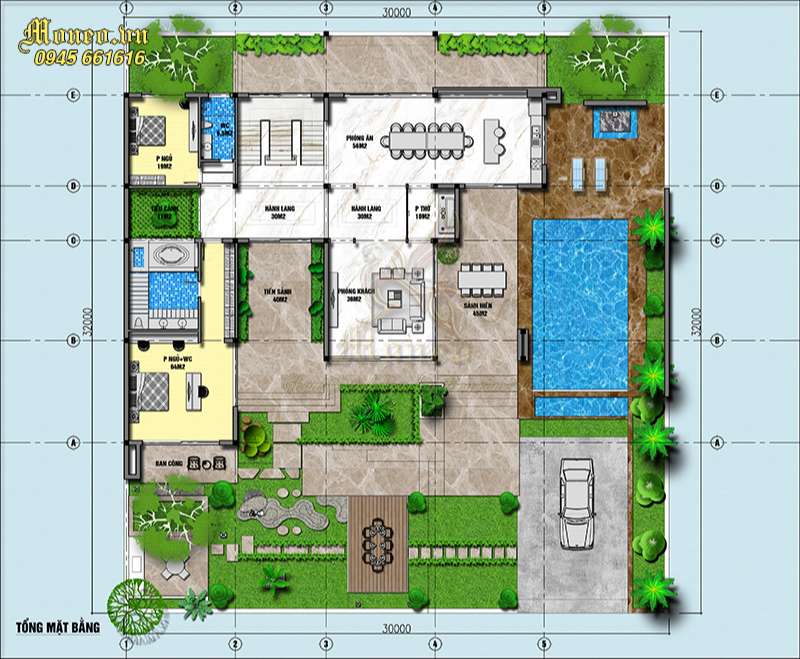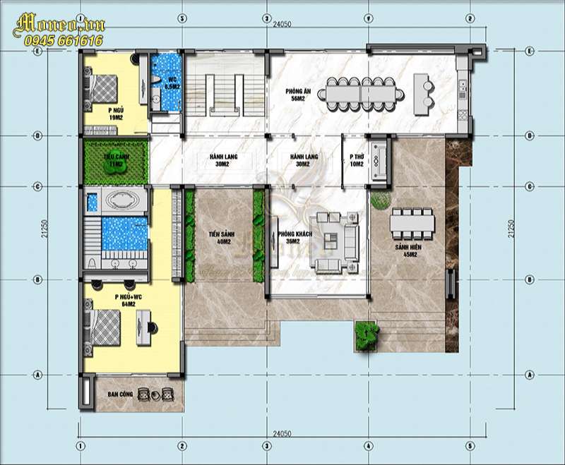 +) Tầng 1: Phòng ngủ + wc: 64m2, tiền sảnh 40m2, phòng khách 36m2, sảnh viền 45m2, phòng thờ 10m2, hành lang 30m2, hành lang 30m2, tiểu cảnh 11m2, phòng ngủ 19m2, wc 6.5m2, phfng ăn 56m2