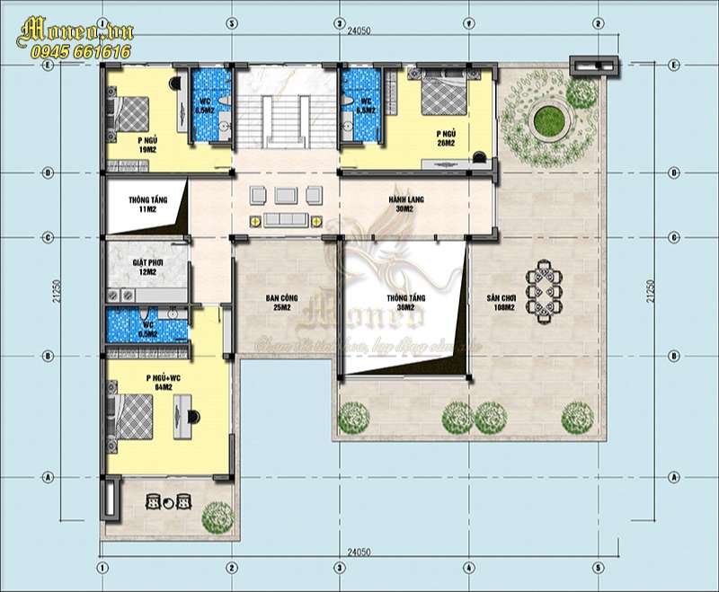 +) Tầng 2: Phòng ngủ + wc: 64m2, sân chơi 108m2, thông tầng 36m2, ban công 25m2, wc 6,5m2, giặt phơi 12m2, thông tầng 11m2, hành lang 30m2, phòng ngủ 26m2, wc 5.5m2, wc 6.5m2, phòng ngủ 19m2.